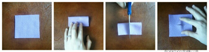 1. Take your felt square and fold it in half. Cut a slit that is big enough for the button to fit through.