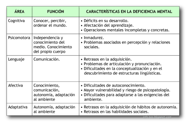 El área cognitiva es la más significativa, ya que el déficit en la función intelectual es nuclear en la deficiencia mental, de forma que las clasificaciones de ésta se basan en el nivel de inteligencia.